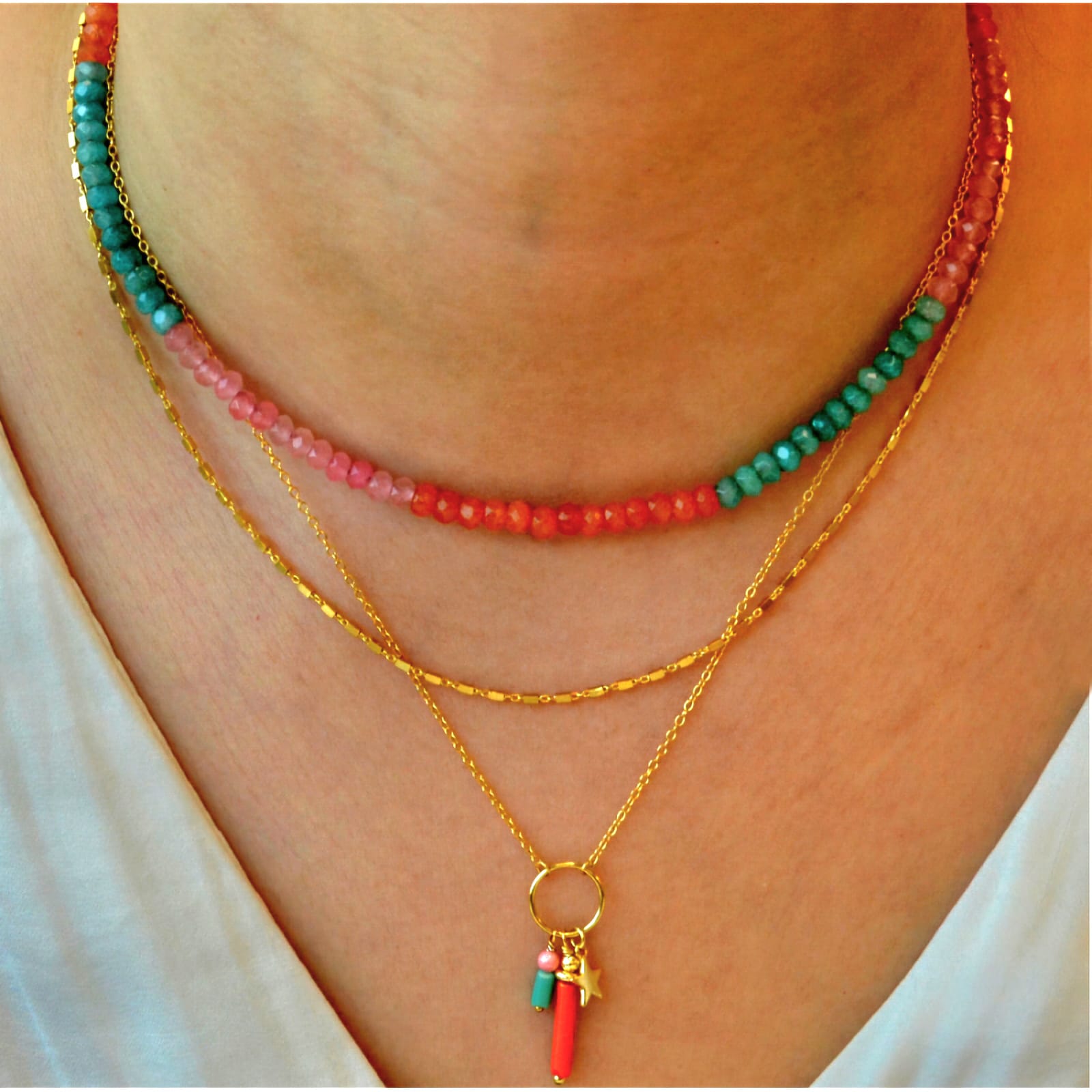 Three bold pendants in gold, orange, and turquoise โ€” the perfect mix of warm, vibrant, and cool tones. Sleek and lightweight, this long chain adds effortless color and shine to any look.
