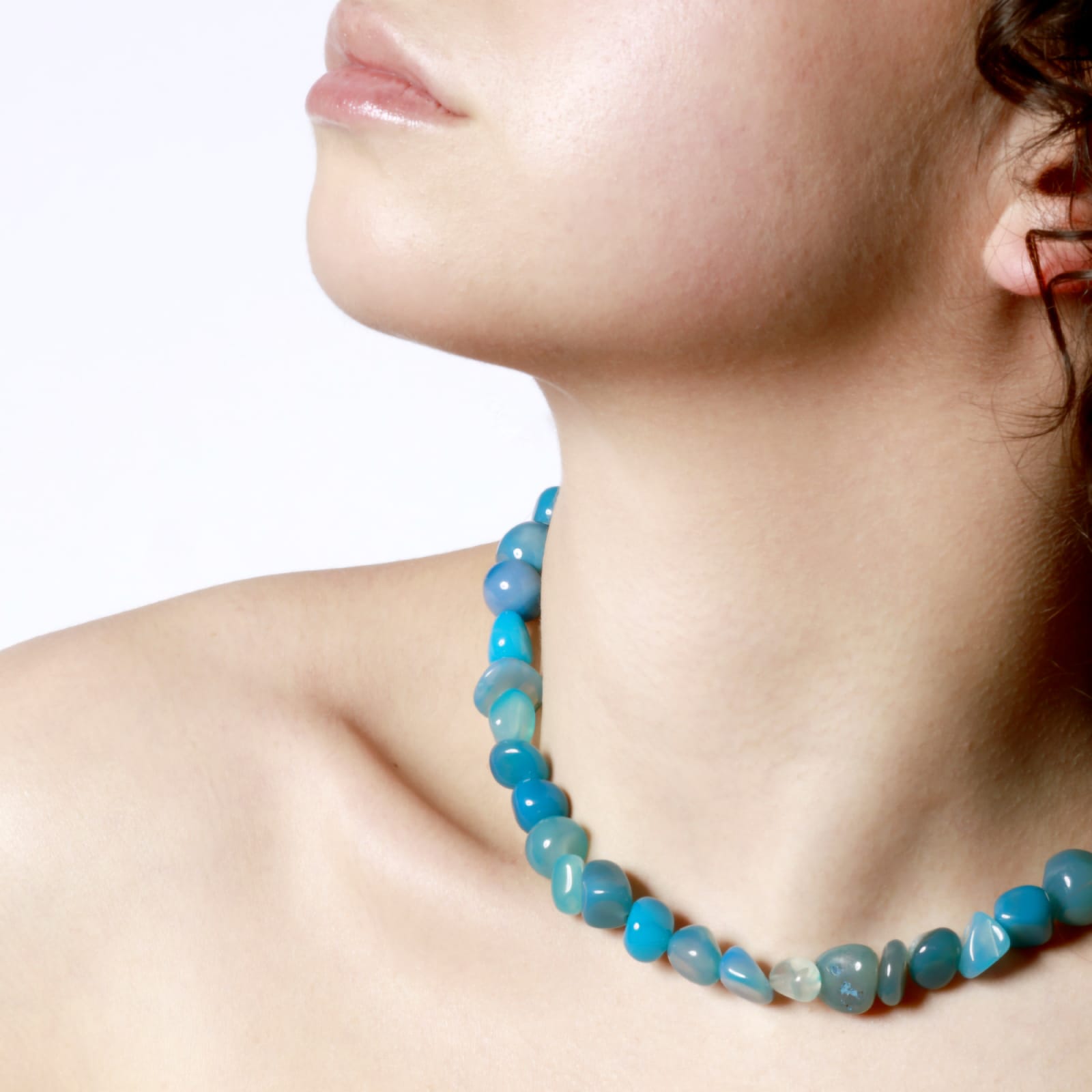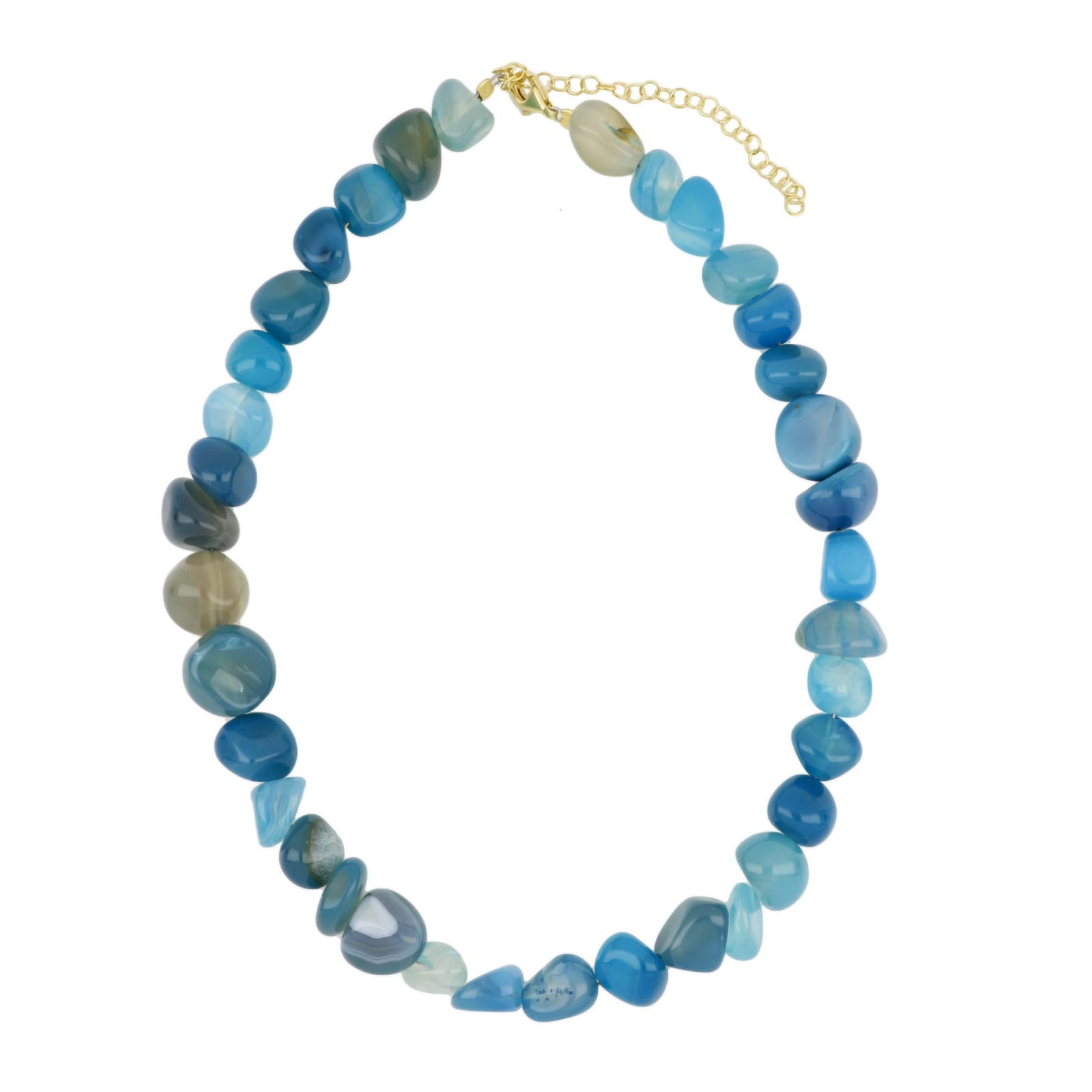 Crafted with natural blue agate stones, this necklace channels the calm strength of the sea โ fluid, grounded, and endlessly captivating.