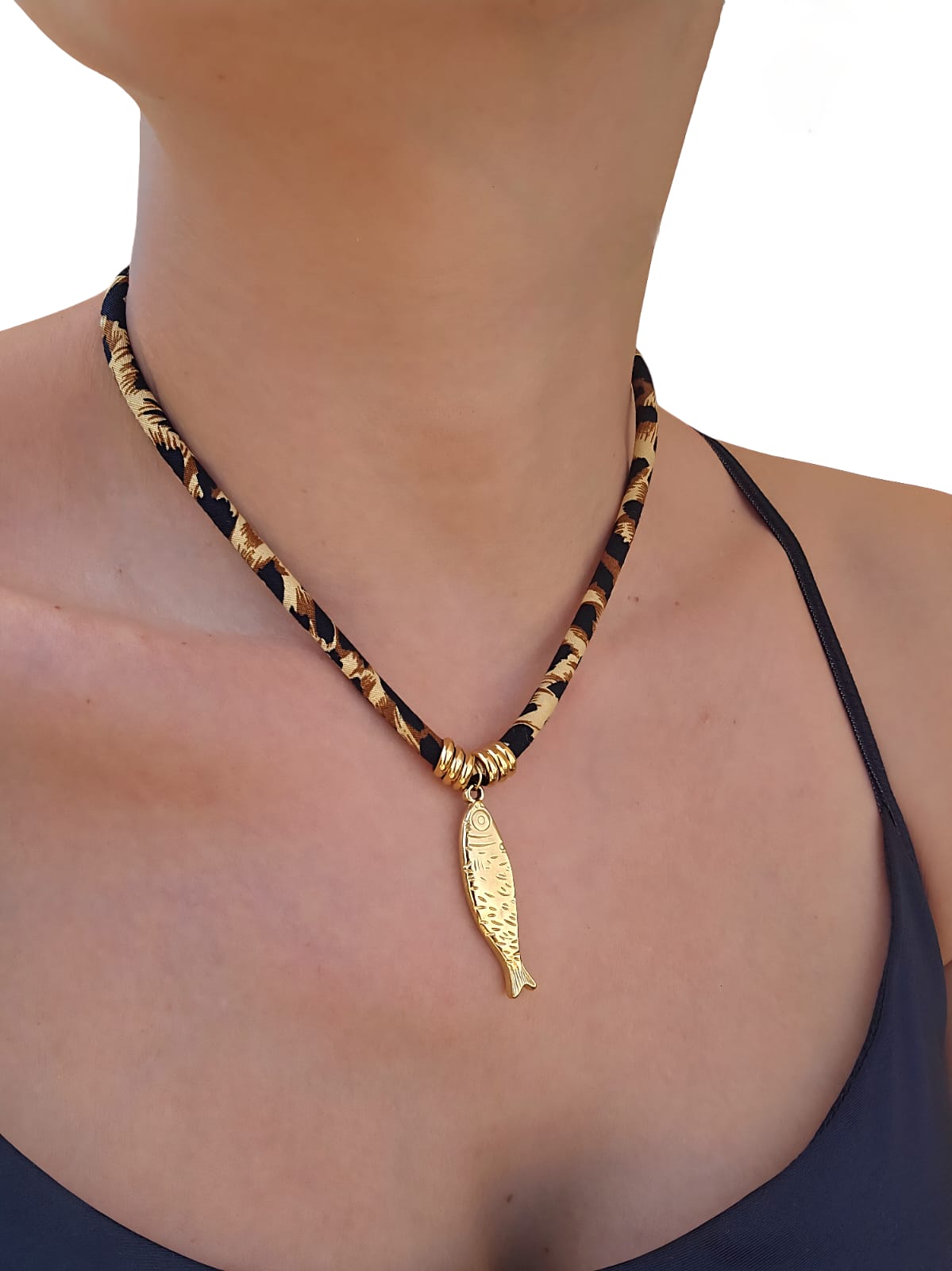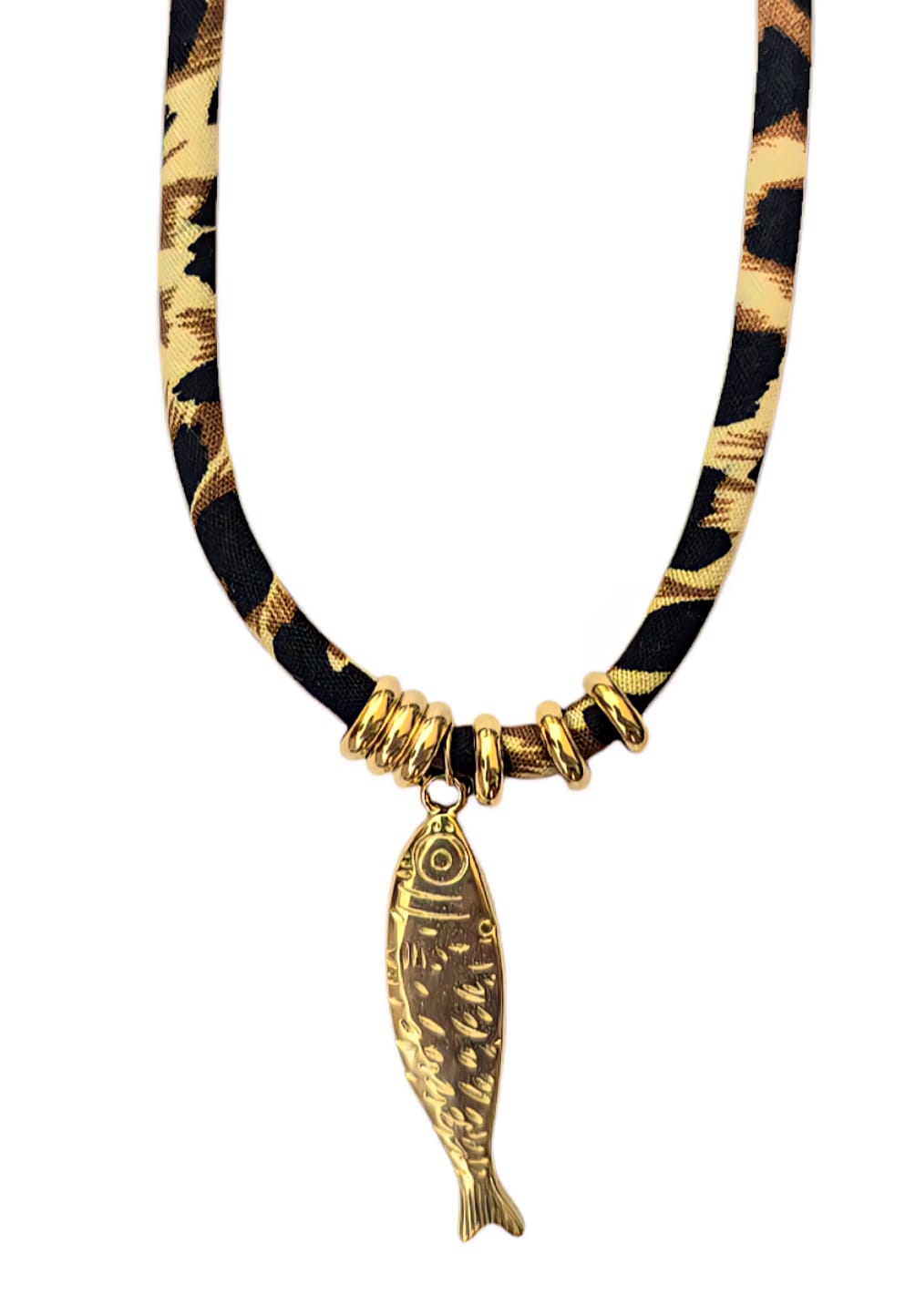 Hook attention with this fierce and fashion-forward piece. A gleaming gold-tone fish charm hangs from chunky polished rings, all strung on a bold leopard-print fabric cord that brings instant edge and character.