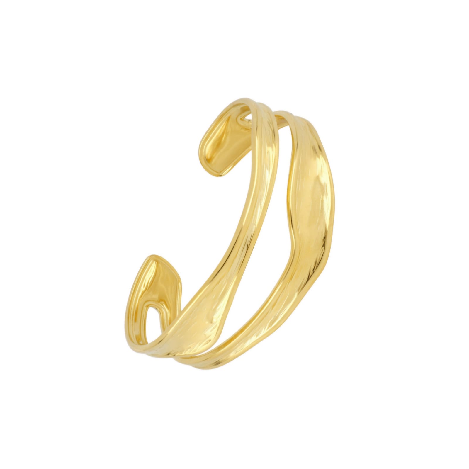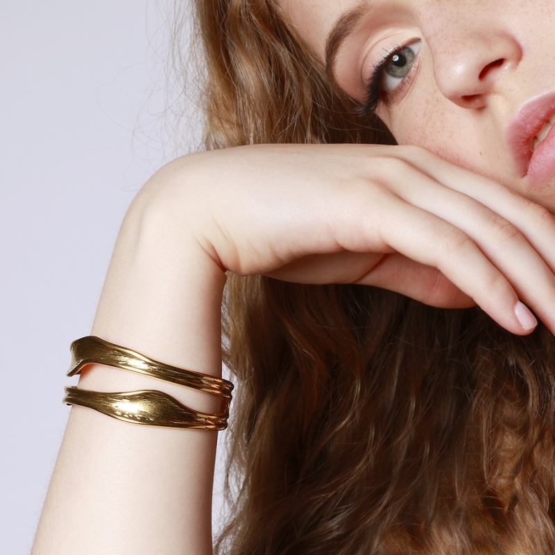 A sculptural statement piece inspired by ancient Hellenic art. This bold, wavy cuff is crafted to sit elegantly on your wrist or higher on your arm, adding a touch of drama to any ensemble.